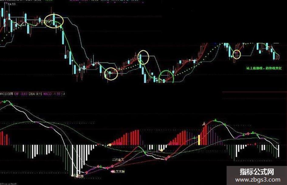 降:=HHV(EMA(C,3),8),COLORCYAN; 升:=LLV(EMA(C,3),8),COLORRED;走势:=EMA(C,3),COLORYELLOW;