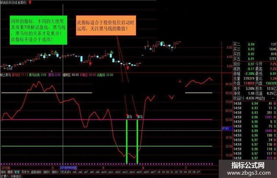黑马出现:IF(CROSS(黑马线,9),50,0),STICK,LINETHICK6,COLOR00FF00,COLORGREEN;