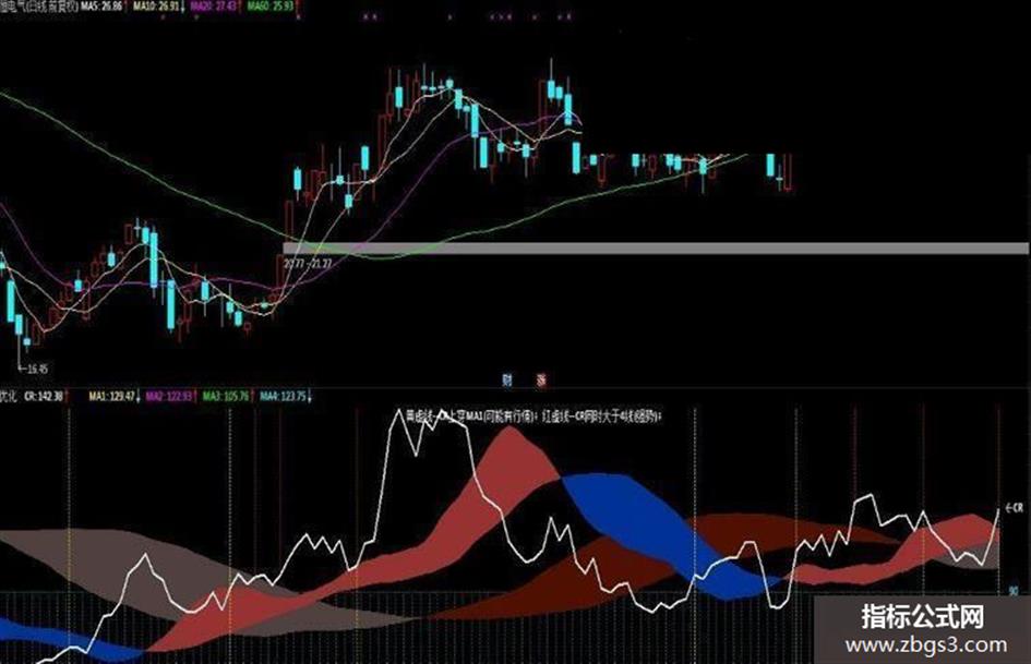 DRAWTEXT_FIX(1,0.40,0.00,0,'黄虚线--CR上穿MA1(可能有行情);红虚线--CR同时大于4线(强势);'),COLORWHITE;
