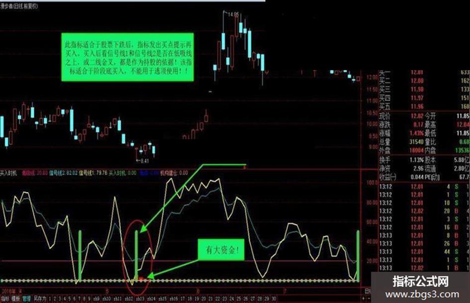买入时机:IF(CROSS(信号线1,3),50,0),LINETHICK8,COLORLIGREEN,STICK;