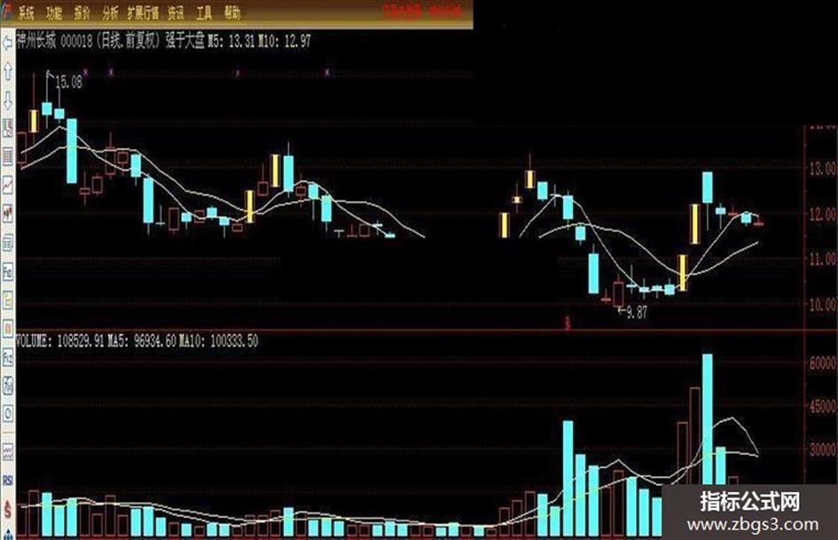 STICKLINE(DYNAINFO(4)>0 AND C>O AND BARSLAST(V1/V2<1.38),CLOSE,OPEN,0.95,0)COLOR00FFFF;