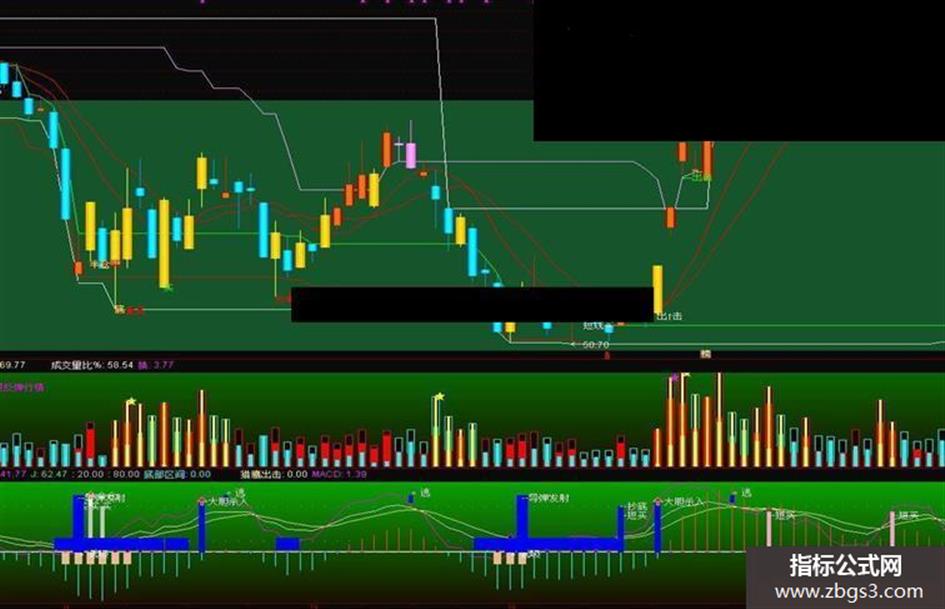 DRAWTEXT(((((LOW <= 上) AND (HIGH >= 短期底部)) AND (CLOSE >= 长期底部)) AND ((CLOSE / OPEN) > 1.03)),(LOW - 0.08),'抄★底'),COLOR0000FF;