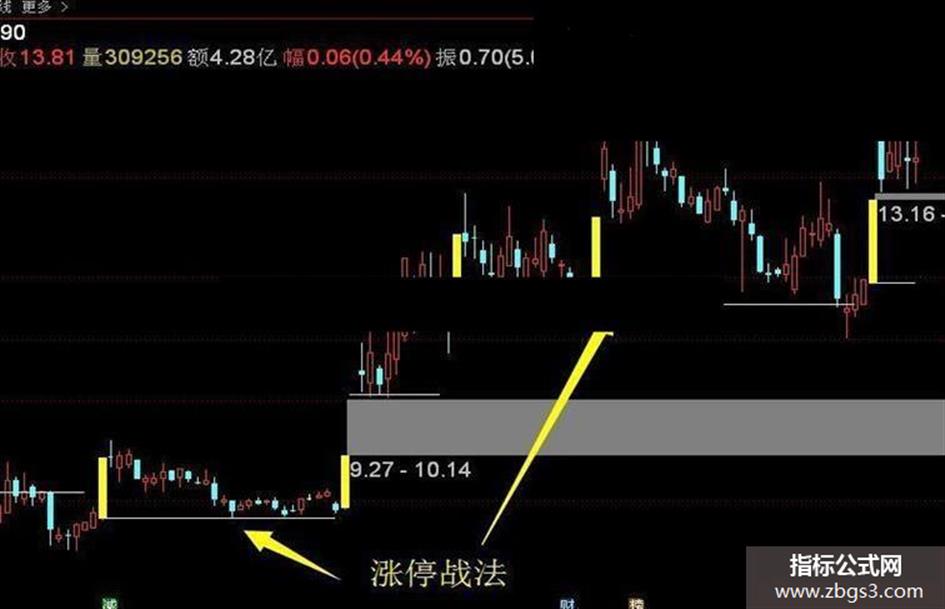 ZT:=BARSLAST(C/REF(C,1)-1>=0.1-0.01/REF(C,1)); DRAWLINE(ZT=0,O,REF(ZT=0,1),REF(O,1),1); STICKLINE(ZT=0,C,O,3,0),COLORYELLOW;