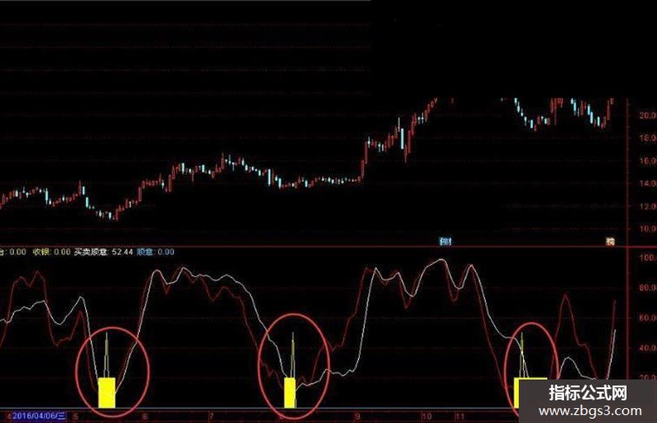 这是个预测底部的指标,收银台也可看做黄金坑,股价经过一段下跌后在反弹区间形成一个坑,可以在低位寻找买入点.两个脉冲信号是到底信号,准确率非常高的指标
