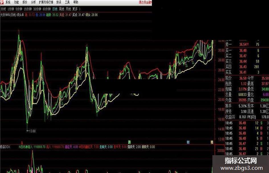 领头:IF(CROSS(趋势,高),高*1.01,低),COLOR00FFFF,LINETHICK2;