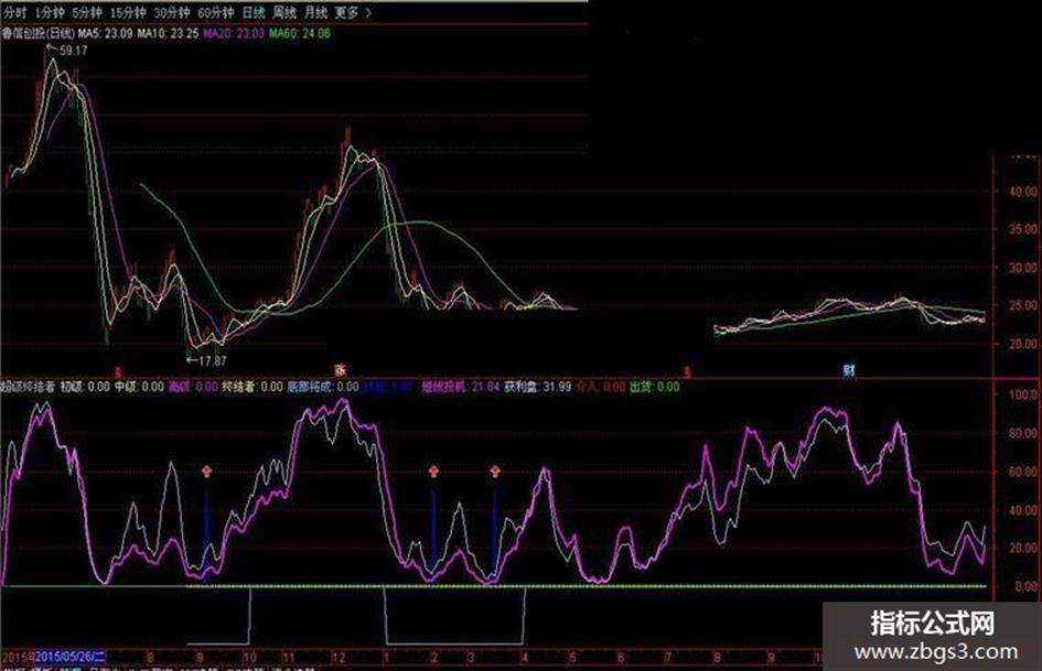 短线投机:EMA((CLOSE-LLV(CLOSE,55))/(HHV(CLOSE,55)-LLV(LOW,55))*100,5),LINETHICK2,COLORFF00FF;