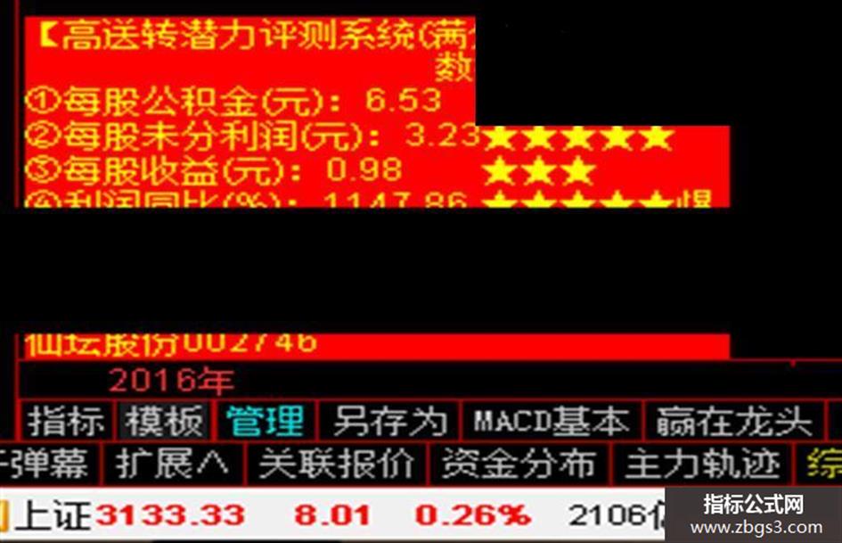 DRAWTEXT_FIX(1,0,0,0,'【高送转潜力评测系统(满分5星)】 V1.0')COLORYELLOW;