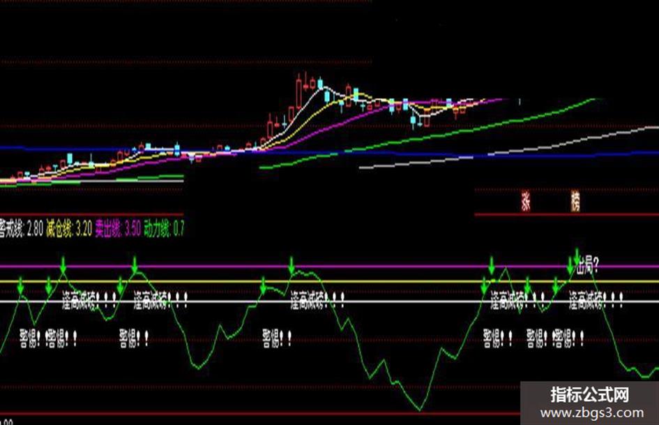 DRAWTEXT(CROSS(动力线,减仓线),2.8,'逢高减磅!!! '), ,;
