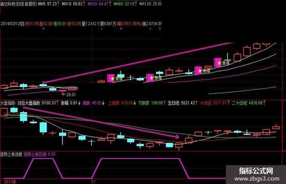 本指标选出的信号仅表明该股票处于逆势上涨趋势中,而并不是大多数人为的买入点,所以很多人抱怨信号太多,不准确。其实,指标的任务仅仅只是完成第一步工作,就是发出信号让你找出逆势上涨的股票,第二步是重点,就是研判股票的逆势上涨的趋势是否能够真正成立,延续下去。关键点在于,只要能买在这种逆势上涨趋势的延续性上,就成功了,不必在乎多赚或少赚几个点。理论上的最佳买点:应该是在个股回调末期和大盘企稳或反弹的结合点上。