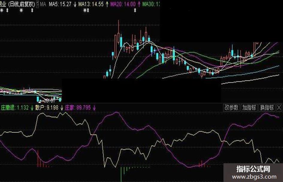 以前炒股,有个老师跟我说,跟着庄做才挣钱,后来我就找指标啊,各种找,后来找到一个,经过使用,还在用的一个显示庄散关系的指标,但是我其实就是看趋势 ,比较傻瓜的庄线上穿散线就买,相反卖,源码分享给大家,不是原创,在这谢谢原创老师,大家要是还有好用法就回帖提出来啦