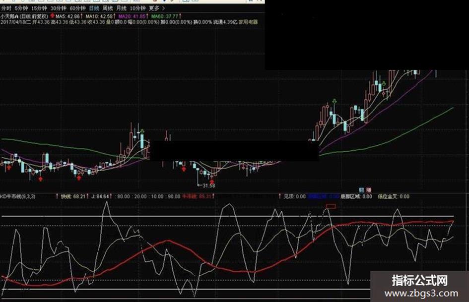 这是一个观察大方向大趋势的指标,用红色牛线叠加了KDJ指标更加直观,使用心得方面,个人感觉:当周线与日线的红色牛线指标向上时,KDJ金叉买入成功的机率较高。相反,当周线与日线红色牛线指标向下时,KDJ死叉卖出的止损止盈成功率较高。