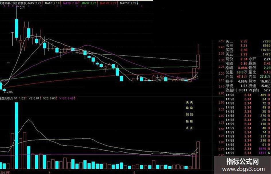 说明:当出现洗盘到极点信号时,可以分批建仓,当V5快要上穿v20时,就是要拉升了;