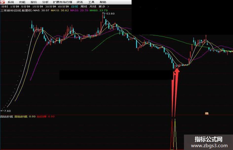 抢反弹:BB1=1 AND C=LLV(C,10) AND C<L*1.045 AND V<HHV(V,10) AND C>LC*0.9015,COLORRED;