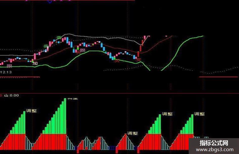 DRAWTEXT(REF(火,3)>0 AND REF(火,2)>0 AND REF(火,1)>0 AND 火=0 AND REF(火,1)>山,REF(火,1),'调整'),COLORYELLOW , ;