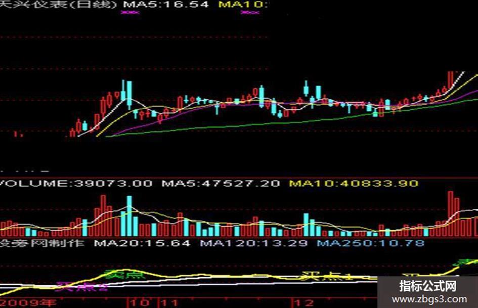 DRAWTEXT(ma120>=ref(ma120,1) and cross(c,ma20) and cross(c,ma120) and v>ref(v,1),l-0.13,'买点2'),colorff00ff ;
