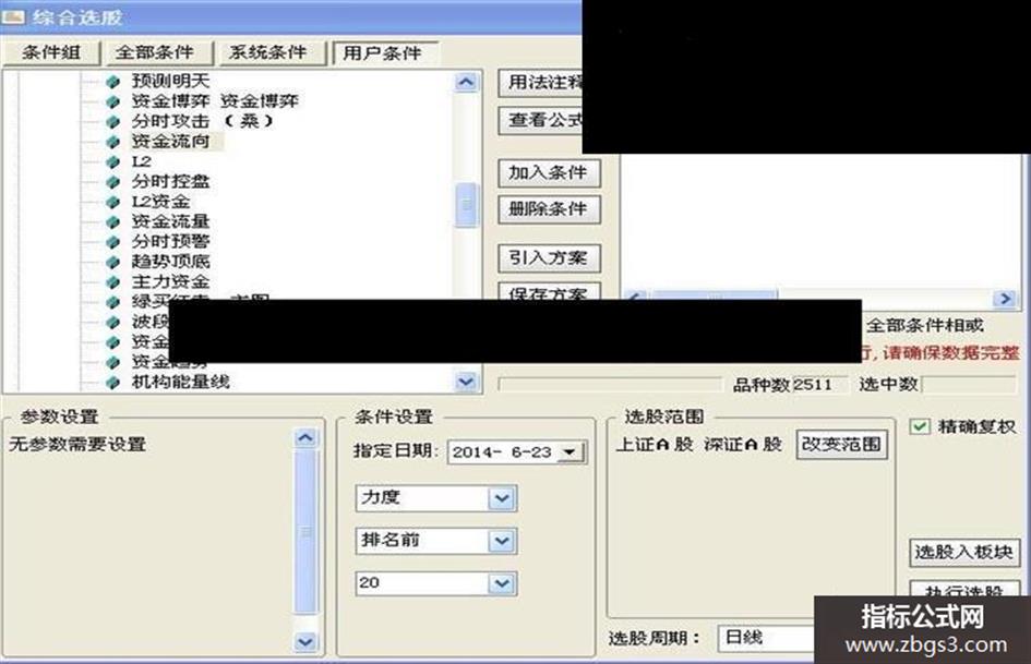 1.下载并安装资金流向指标。 2.综合选股-选择资金流向指标-流量幅-排名前-20-加入条件 -选择资金流向指标-力度-排名前-20-加入条件 3.执行选股