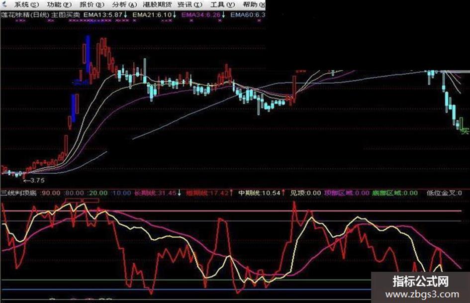 见顶:(REF(中期线,1)>85 AND REF(短期线,1)>85 AND REF(长期线,1)>65) AND CROSS(长期线,短期线) ;