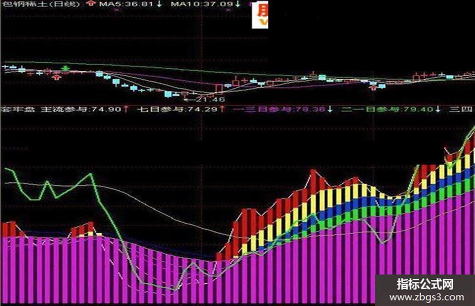 主流认知:EMA(100*(INDEXC-LLV(INDEXL,34))/(HHV(INDEXH,34)-LLV (INDEXL,34)),3),COLORGREEN,LINETHICK2;