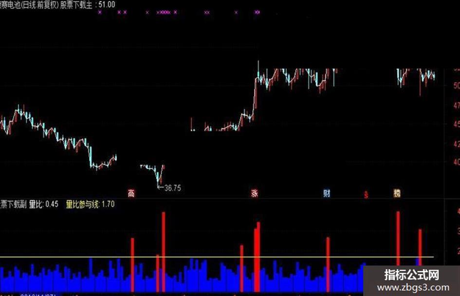 量比:VOL/REF(MA(VOL,5),1),COLORRED,LINETHICK0; STICKLINE(量比>0,0,量比,2,0),COLORBLUE; STICKLINE(量比>=1.7,0,量比,2,0),COLORRED; 量比参与线:1.7,COLORYELLOW;