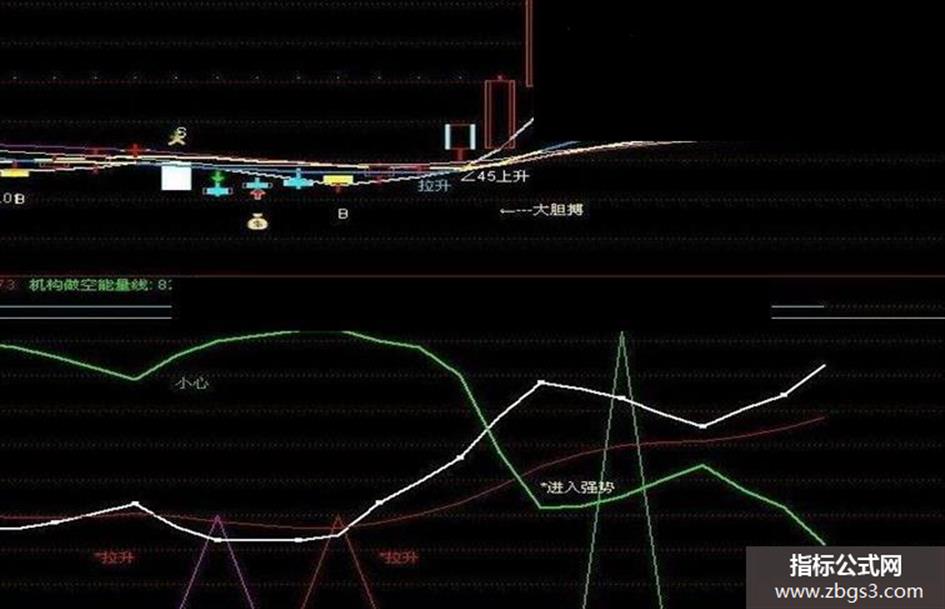 DRAWTEXT(CROSS(跨越,机构做空能量线) ,大底+40,'*进入强势'),COLORYELLOW;