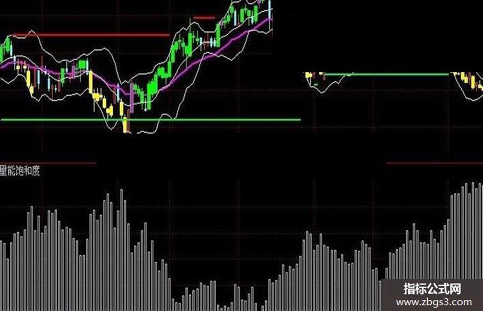 AA:=100*(HHV(HIGH,68)-CLOSE)/(HHV(HIGH,68)-LLV(LOW,68)); 量能:STICKLINE(AA>=2,AA,0,2,1),COLORBBBBBB; 饱和:STICKLINE(AA>=99,AA,0,2,1),COLORRED; 饱和度:STICKLINE(AA>=99,90,100,2,1),COLORGREEN;