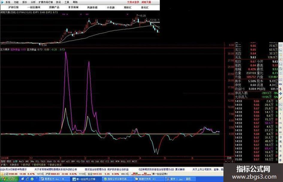 说明:红线是主力资金 主力在不断地吃货 主力资金上升的角度大于35的时候就变成黄色线 大于45度时就能出现连续的涨停 紫线是拉升资金也就是游资散户 青色是主力出货 。