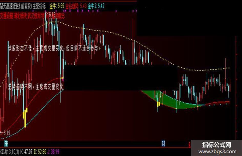 DRAWTEXT_FIX(情况13=1,0.035,TS13,0,'该 股 形 态 不 佳 ,注 意 成 交 量 变 化,但 目 前 不 适 合 参 与 。'),COLORWHITE;{白}
