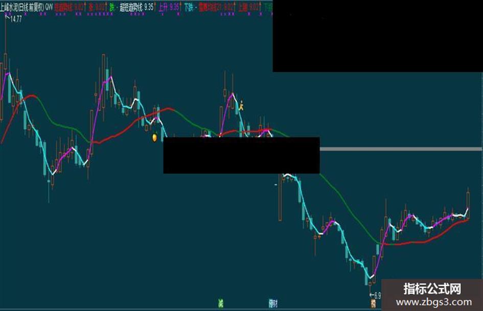 涨:IF(短趋势线>REF(短趋势线,1),短趋势线,DRAWNULL),COLORRED,LINETHICK2;