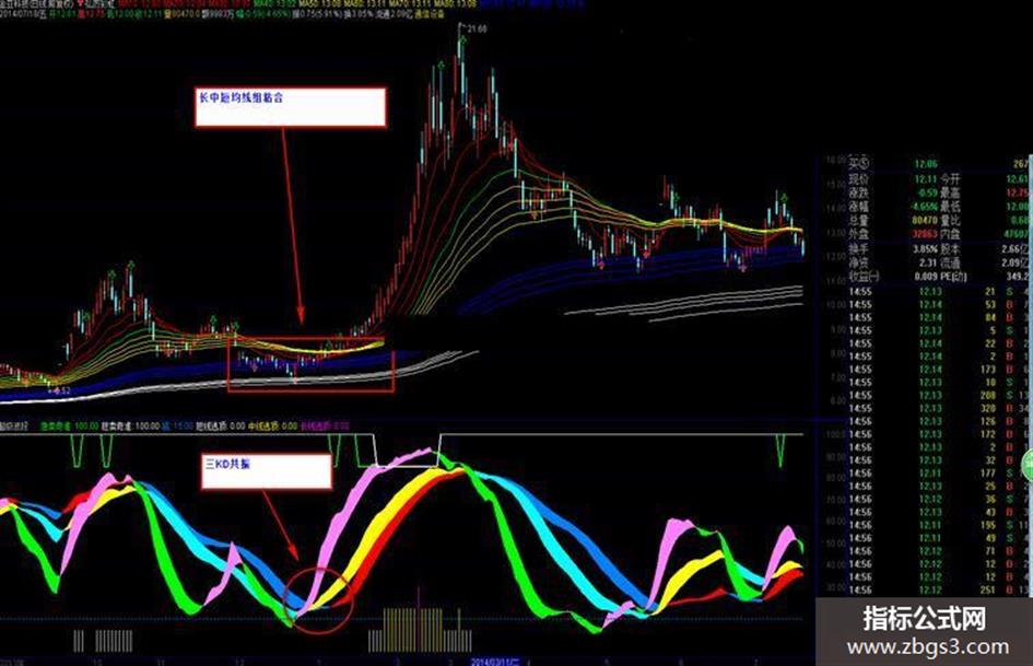 本指标由21KD,35KD,55KD组成,体现长中短趋势!利用三KD共振买入!如果再,结合均线粘合买入更隹!抓到大、中黑马不再是梦!上下卖出符号结合,提示长中短頂部