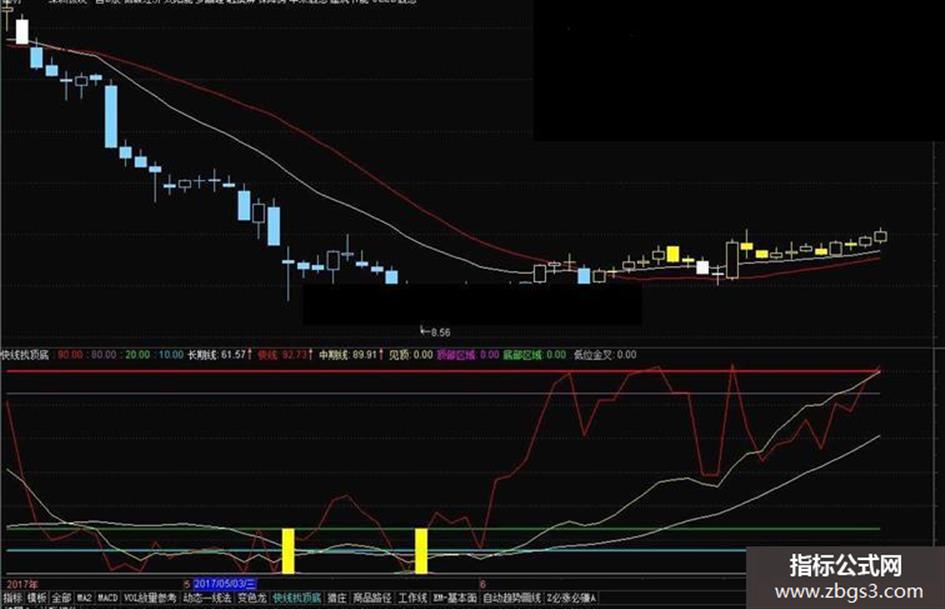 底部区域:(长期线<12 AND 中期线<8 AND (快线<7.2 OR REF(快线,1)<5) AND (中期线>REF(中期线,1) OR 快线>REF(快线,1)))