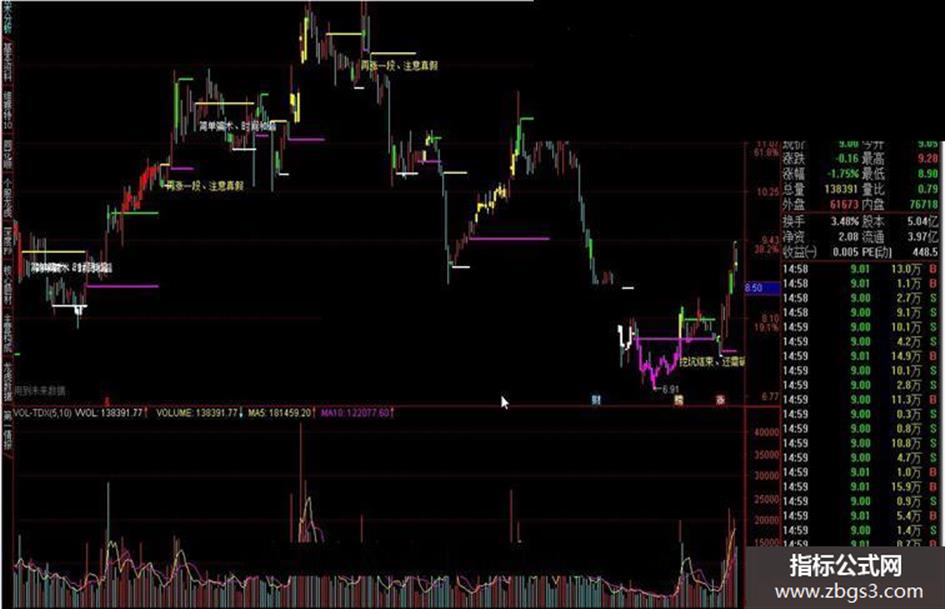 指标低点:IF(WW,DRAWLINE(VA4,L,REF(VA4,1),REF(L,1),1),DRAWNULL),COLORWHITE,LINETHICK2;