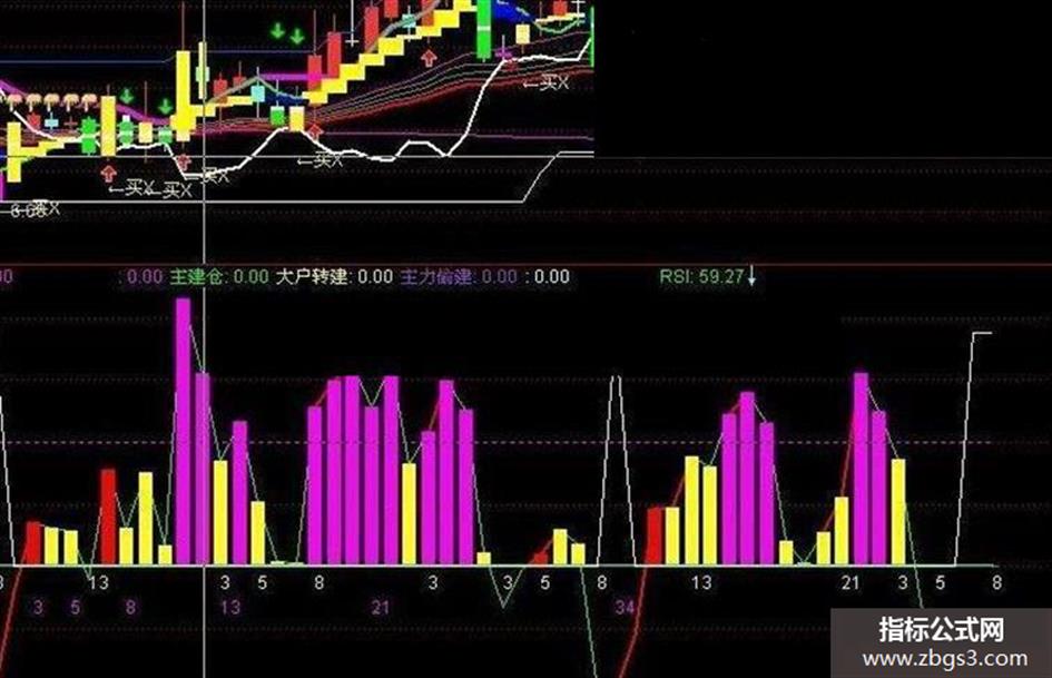低吸:=IF(CROSS(RSI,11),0.60,0)*100,COLORWHITE;