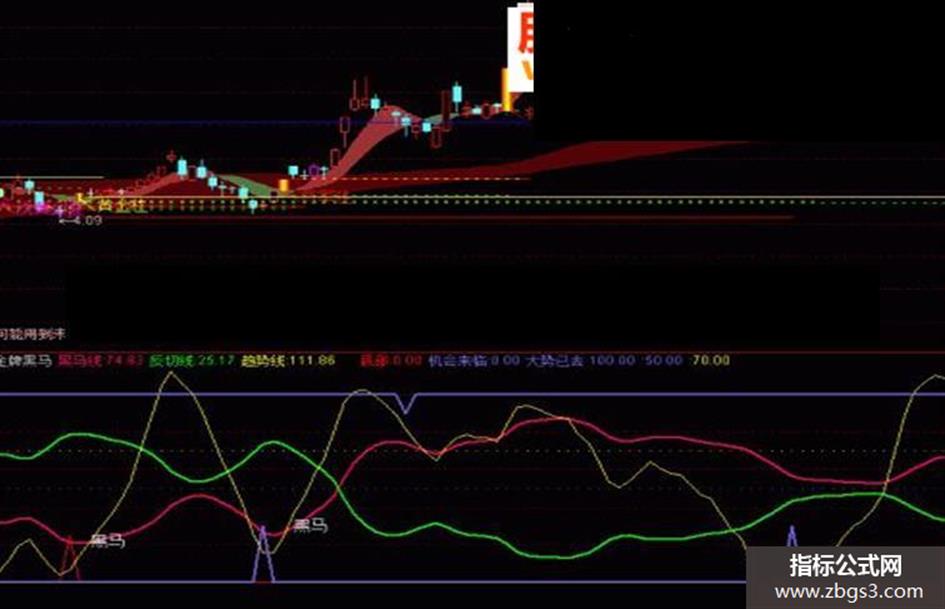 大势已去:IF(CROSS(黑马线,A1) AND 黑马线>70 AND 趋势线>80,90,100),LINETHICK2,COLORE66878;