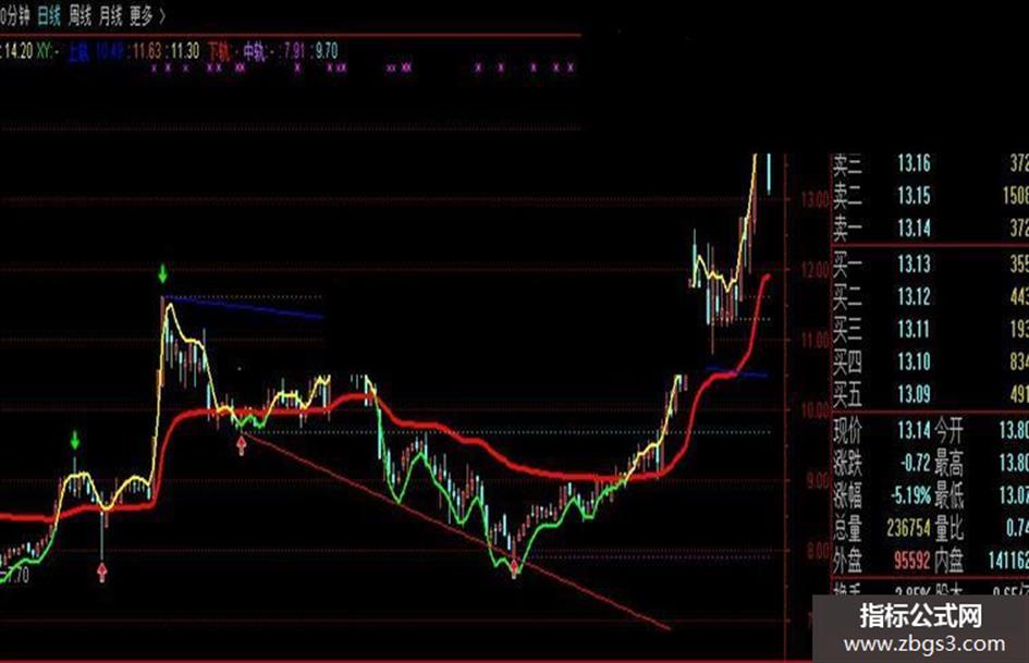 通达信【起伏波动带】主副/选套装指标红线代表上升趋势绿线代表下降趋势源码