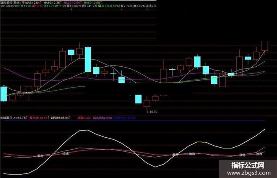 DRAWTEXT(CROSS(黑马线,A5)AND 趋势线<80,黑马线,'追涨');