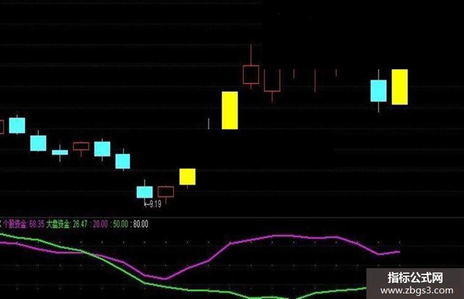 个股资金:EMA(100*(C-LLV(LOW,34))/(HHV(H,34)-LLV(LOW,34)),3), COLORMAGENTA,LINETHICK2; 大盘资金:EMA(100*(INDEXC-LLV(INDEXL,34))/(HHV(INDEXH,34)-LLV(INDEXL,34)),3),COLORGREEN,LINETHICK2; 20,POINTDOT,COLORF00FF0; 50,POINTDOT,COLORGREEN; 80,POINTDOT,COLORWHITE;