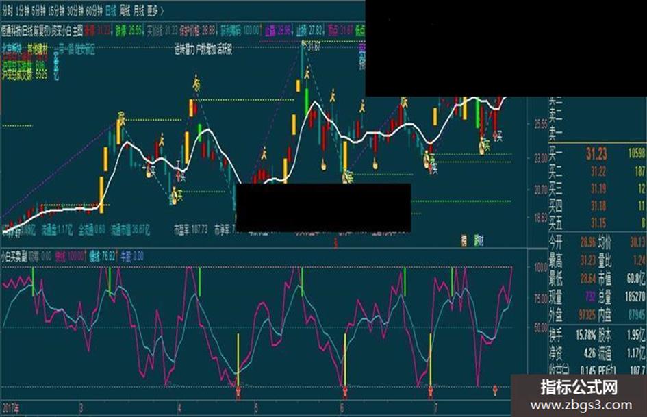 先看一下指标,其实很简单的两条线,记着金叉做好买的准备,死叉立即执行卖出,决不犹豫,就算下一步涨停也不后悔.黄柱代表出手,紫色柱代表加仓介入,绿柱是必须找高点出局.当红箭头与买的标记'B'重合,就别迟疑了.