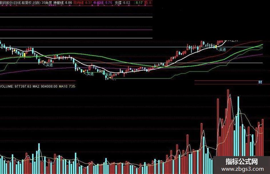 网上搜了一下,找到一非常好的指标,当K线35度角上涨时,有信号提示,感觉不错,现发上来!