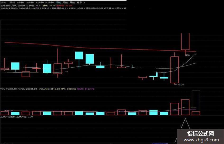 三线开花:(CROSS(快线,慢线) AND REF(CLOSE,1)>快线 AND VOL/REF(VOL,1)>1);