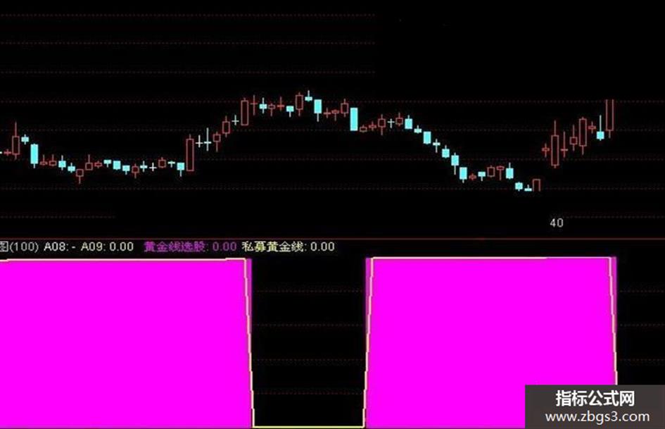 黄金线选股:IF(((CROSS(A09,0.009) AND (OPEN && LOW)) AND (CLOSE && LOW)),20,0),COLORFF00FF;