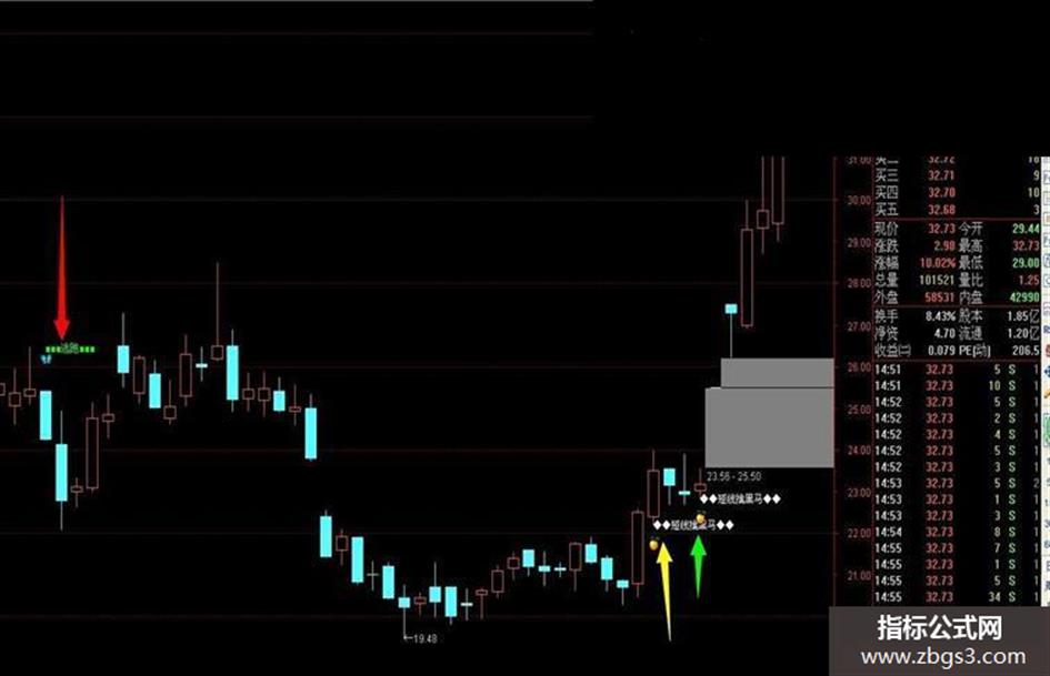 DRAWTEXT(CROSS(RSI,7.1) AND MA(V,5)>MA(V,10),L,'◆◆短线擒黑码◆◆'),COLORWHITE;