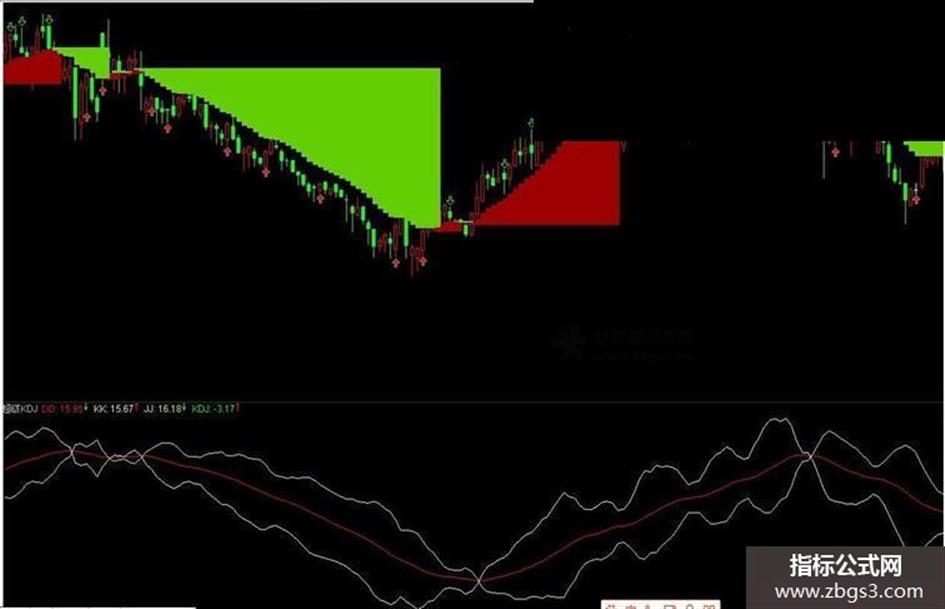 A:=EMA((EMA(CLOSE,29)+EMA(CLOSE,31)+EMA(CLOSE,33))/3,3); DD:REF(A,1)COLORRED; KK:EMA((EMA(CLOSE,1)+EMA(CLOSE,3)+EMA(CLOSE,5))/3,3),COLORWHITE; JJ:A-(KK-A*0.997),COLORYELLOW; KDJ:EMA(HHV(KK,1)/LLV(JJ,1)*100-100,10),COLORGREEN,NODRAW;