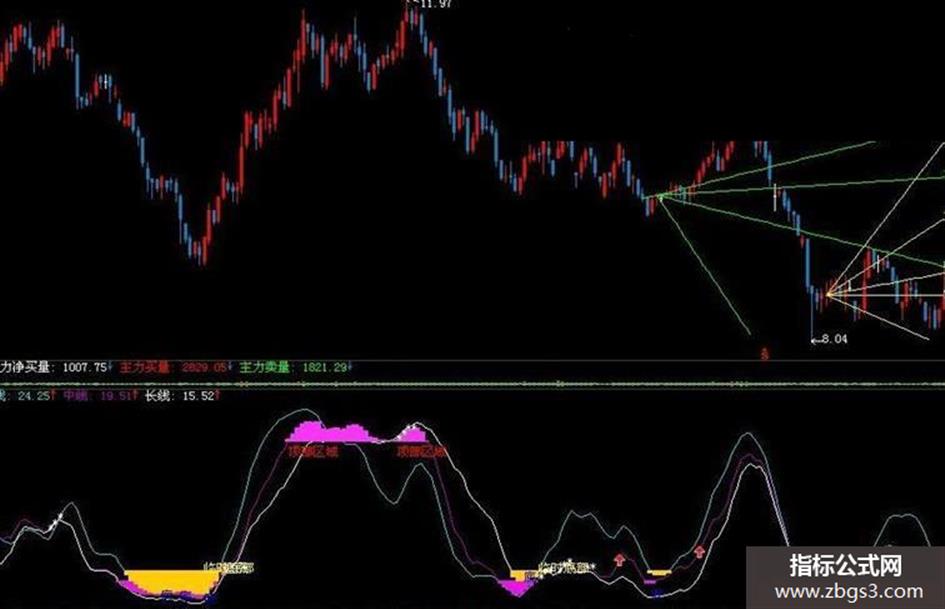 底: DRAWTEXT(CROSS(中线2,-90) AND (长线<中线 AND 长线>REF(长线,1)OR 短线<20 AND 中线<20 AND 长线<20),长线,'底'),COLORBB0000;