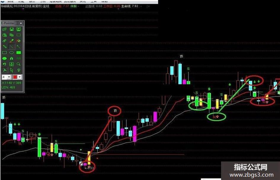IF(CROSS(生命线,工作线),HIGH*1.04,DRAWNULL),CIRCLEDOT,COLORGREEN;