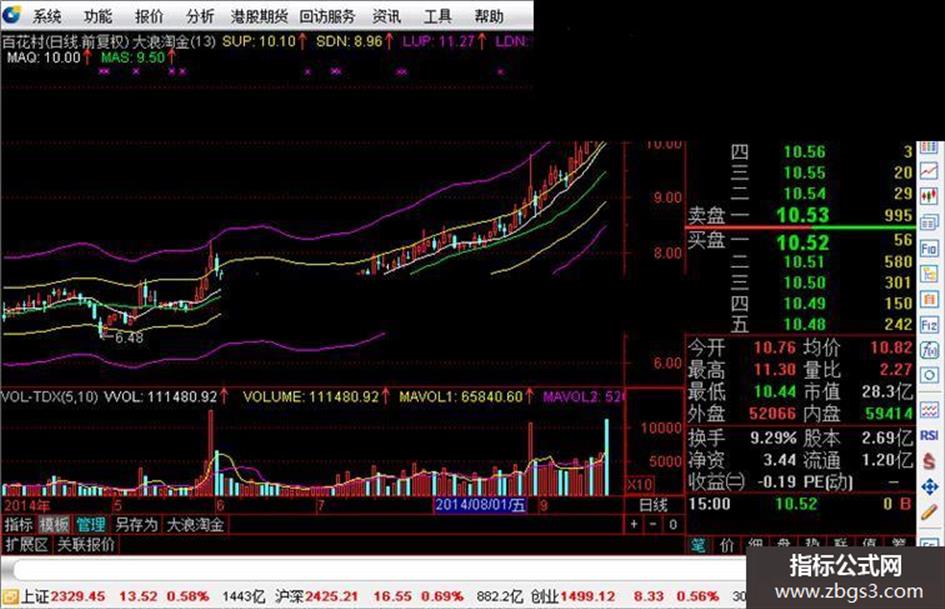 当股价由黄绿通道逐渐上升到紫黄线通道的时候,表明股价已经出现加速的征兆,此时如果股价成功突破将会是另一个波段与短线的介入点。如上图的兴业股份在冲破黄绿通道上轨调整以后继续上涨,表明股价很有可能沿着紫黄通道继续上行。当然,在紫黄线通道内的卖点在哪里,相信不用我明确指出了吧,你懂得。