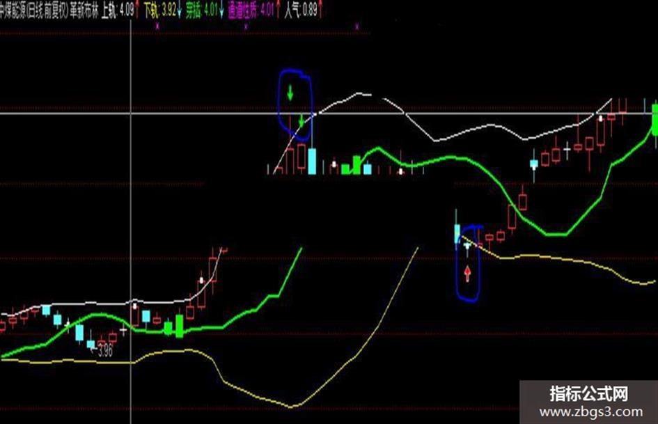 本人一直喜欢布林带,但是总觉得以中线来区分走势的强弱既勉强又滞后,经过革新,设置了一条穿插线,取代了中线的大部功能,同时又能提示买卖,当其下穿K线时后市多为涨;当其上穿K线时后市多为跌。无论上穿下穿,K线变绿以便醒目。激进者还可根据上下轨附近的箭头提示买卖,绝对不是未来函数,放心使用。