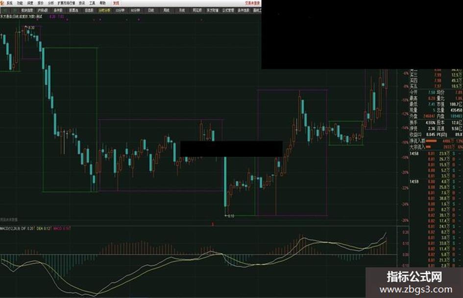 金叉区间最高价 最低价画红色框架 死叉区间画绿色框架 方便同学们根据MACD分析趋势。看似简单画线,还是有点难度。当然你是高手,一切都是浮云,请你绕道。我是半桶水,井底蛙,发帖是给喜欢研究 喜欢MACD的菜鸟的。源码提供,你有本事也多提供一些源码,少喷 干点实事。股市不是一个技术指标能搞定的。多参考一些技术指标,没有坏处。说不定哪一天你就成了。贵在坚持