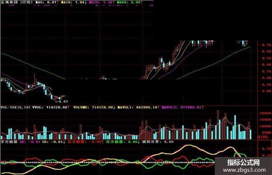 VAR1:=(CLOSE*2+HIGH+LOW)/4; SK: EMA(VAR1,13)-EMA(VAR1,21),COLORFF00FF, LINETHICK3; SD: EMA(SK,2), LINETHICK3; 多方能量: 2*(SK-SD)*3.8,COLORRED,LINETHICK3; 空方能量: (-2)*(SK-SD)*3.8, LINETHICK3; 强弱分界: 0, CIRCLEDOT;