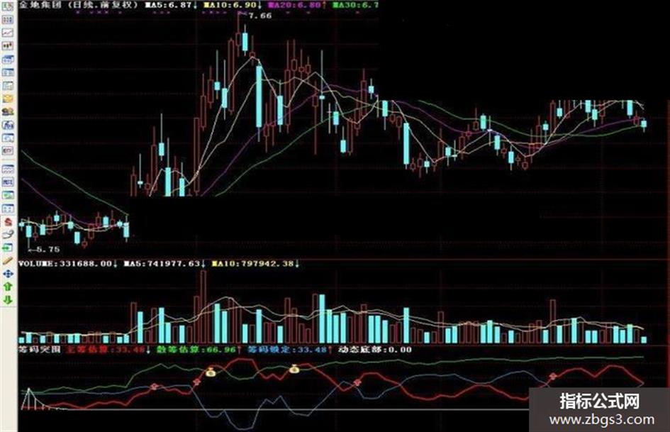 动态底部:EMA(IF(L<= LLV(L,99),SMA(ABS(L-REF(L,1)),99,1)/SMA(MAX(L-REF(L,1),0),99,1),0)*5,3)*5,COLORWHITE,LINESTICK;