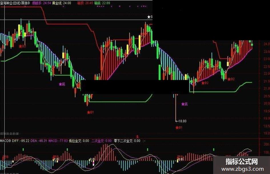 DRAWTEXT(CROSS(VA1,VA2)AND(C>=O)AND 黄金线>REF(黄金线,1),VA1*0.97,'★B2'),COLORRED;